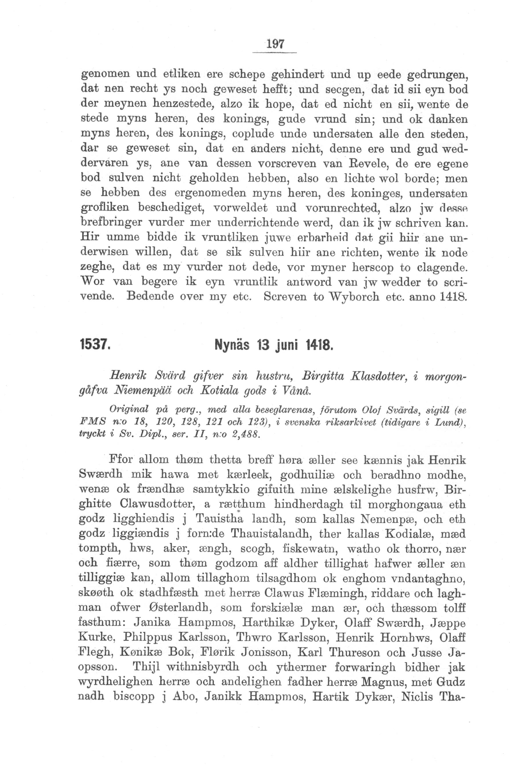 Henrik Svärd ger sin hustru, Birgitta Klasdotter, i morgongåva Niemenpää och Kotiala gods i Vånå.