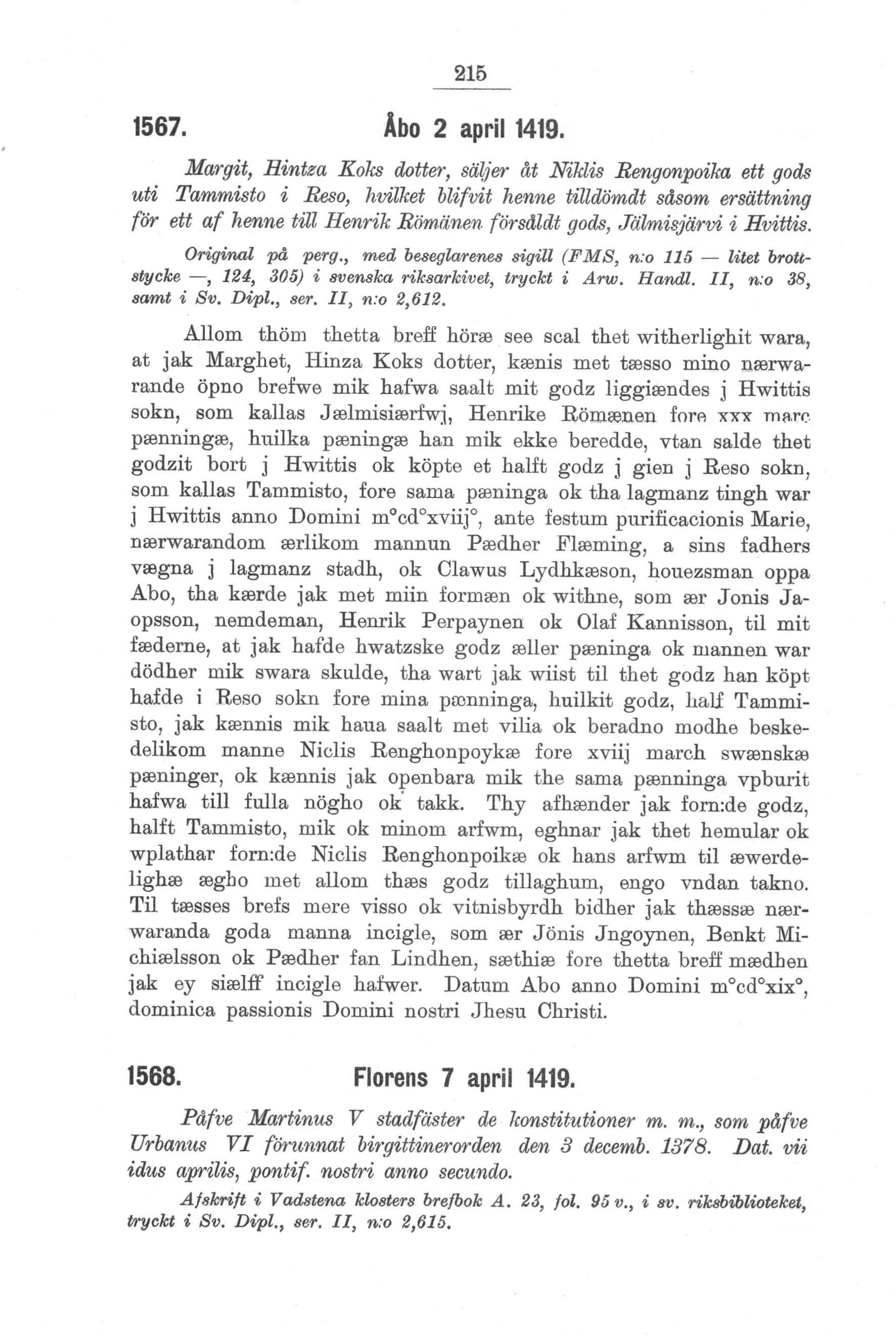 Påve Martinus V stadfäster de konstitutioner m. m., som påve Urbanus VI förunnat birgittinerorden den 3 decemb. 1378. Dat. vii idus aprilis, pontif. nostri anno secundo.