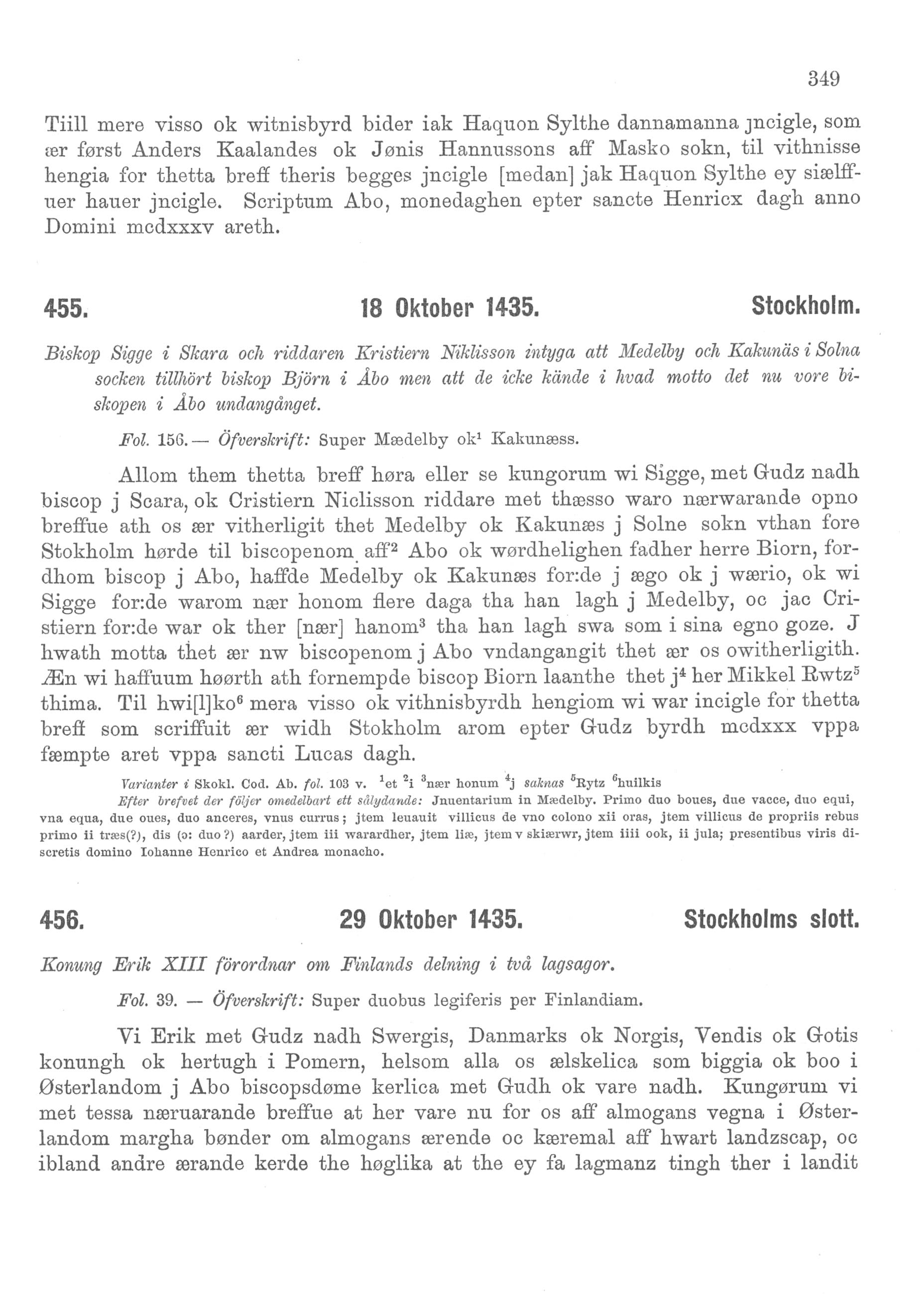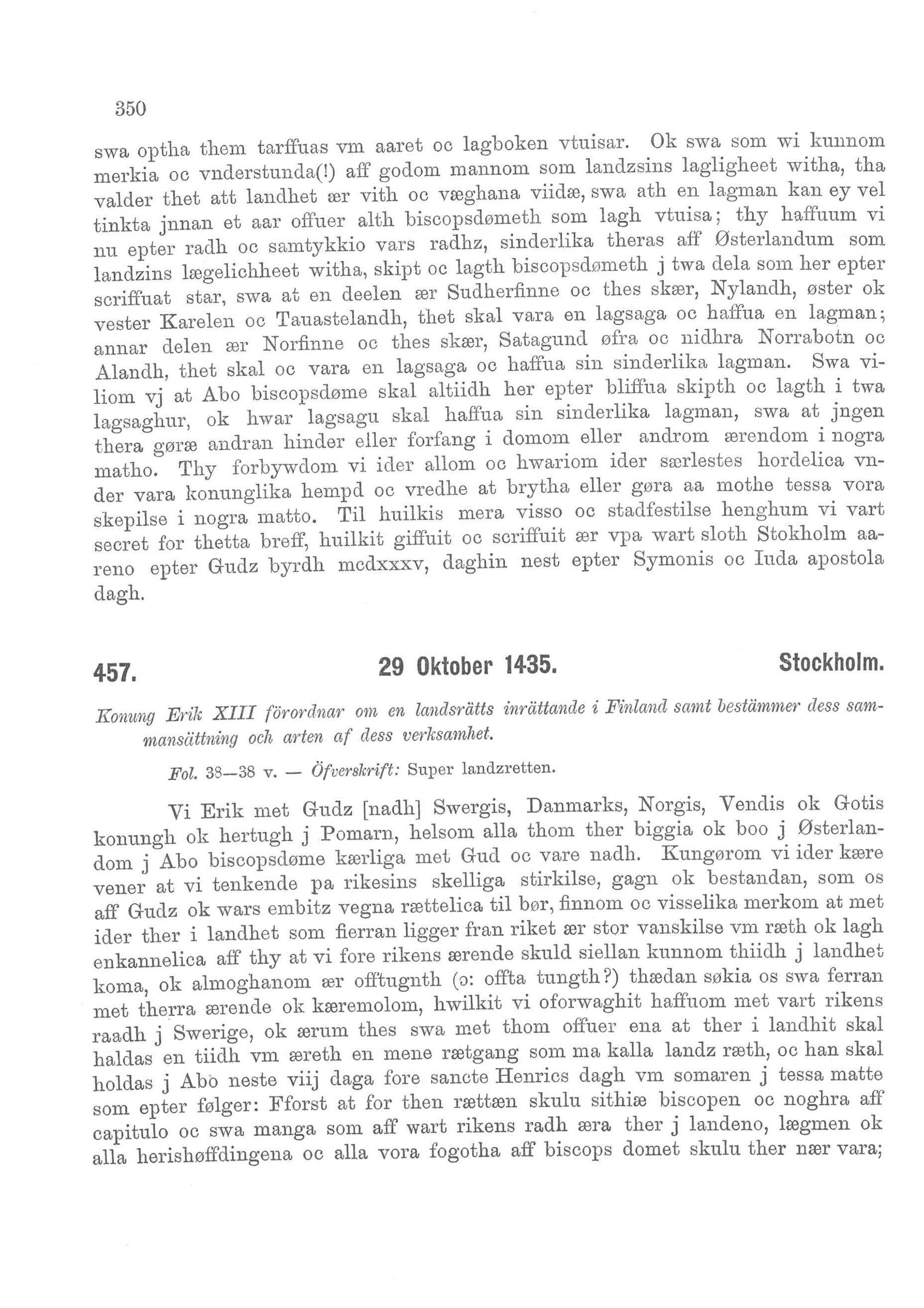 Kung Erik förordnar om Finlands delning i två lagsagor. Dat. daghin nest epter Symonis oc Iuda apostola dagh.