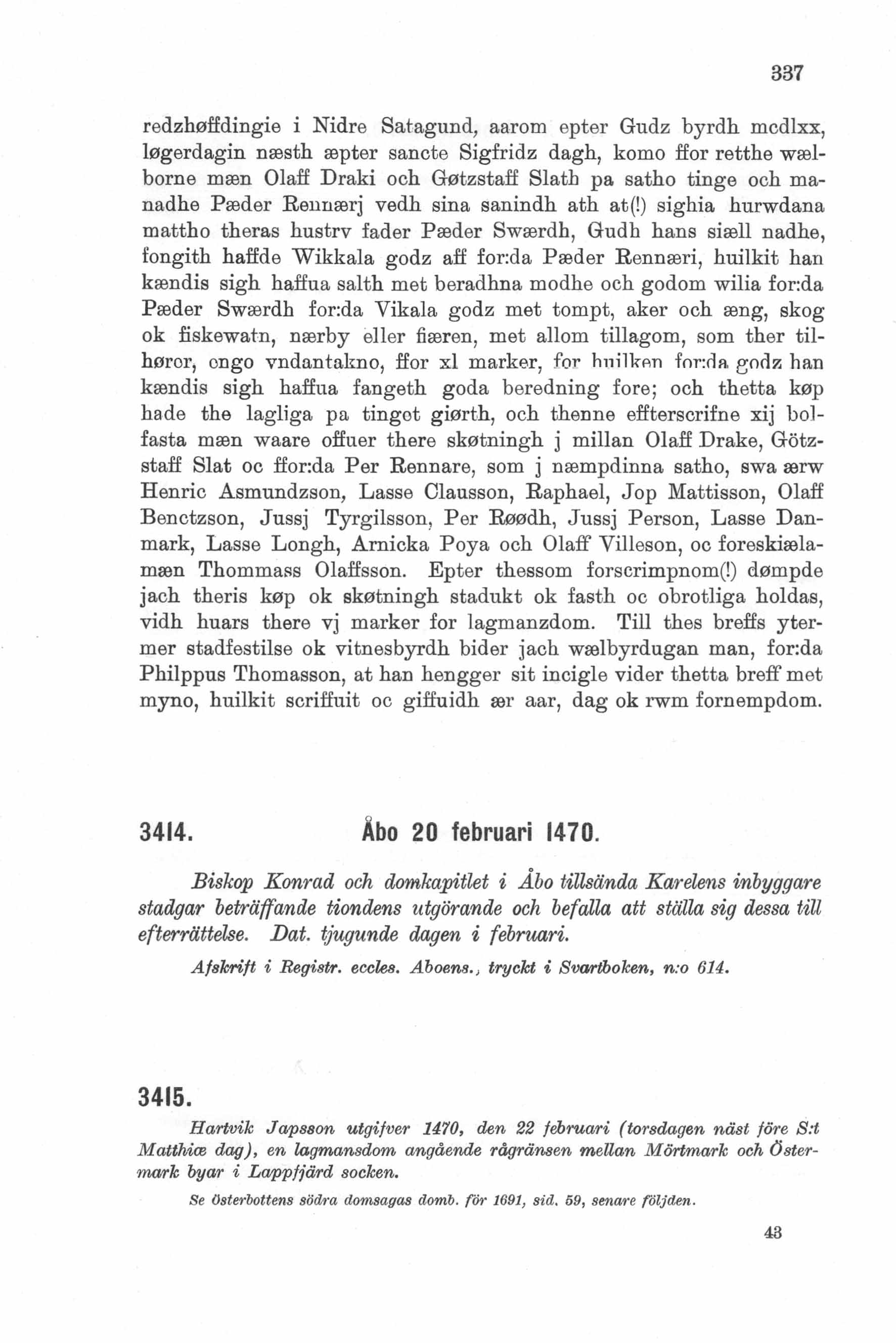 Hartvik Japsson utger 1470, den 22 februari (torsdagen näst före S:t Matthiæ dag), en lagmansdom angående rågränsen mellan Mörtmark och Östermark byar i Lappfjärd socken.