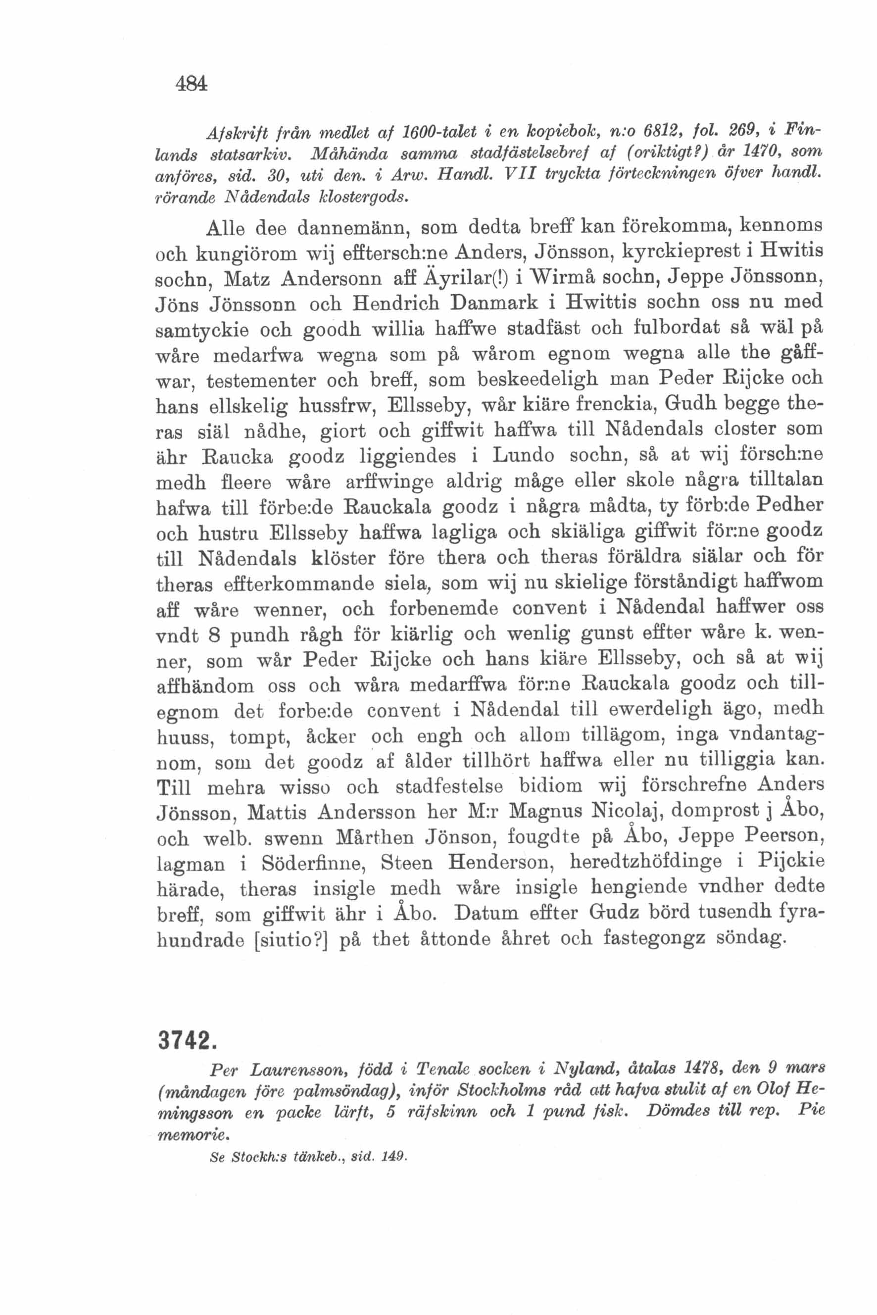 Anders Jönsson, kyrkopräst i Vittis, m. fl. stadfästa framlidne Peder Rikes och hans ävenledes avlidna hustrus gåva av Raukkala gods (i Lundo socken) till Nådendals kloster.