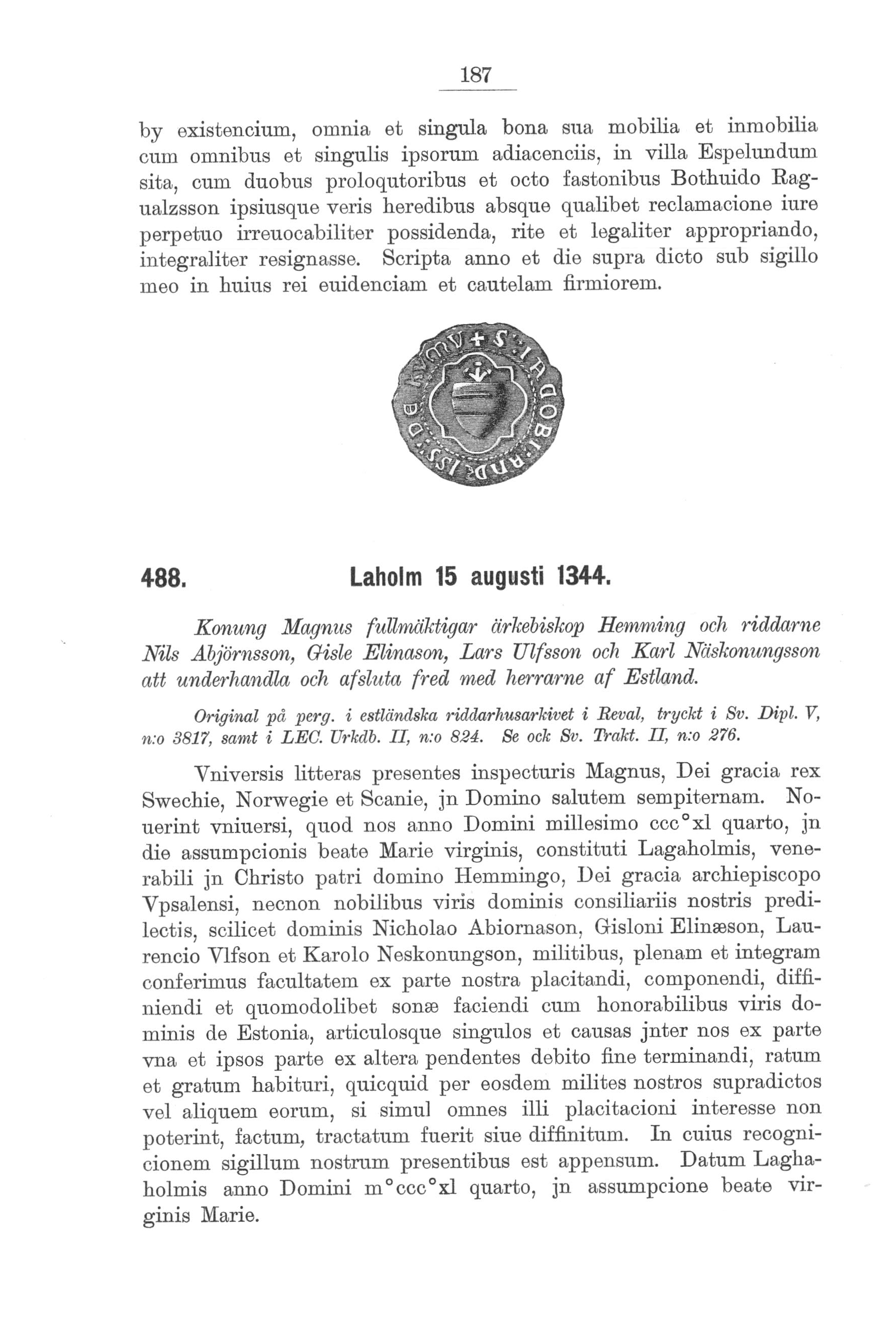 Kung Magnus fullmäktigar ärkebiskop Hemming och riddarna Nils Abjörnsson, Gisle Elinason, Lars Ulfsson och Karl Näskonungsson att underhandla och avsluta fred med herrarna av Estland.