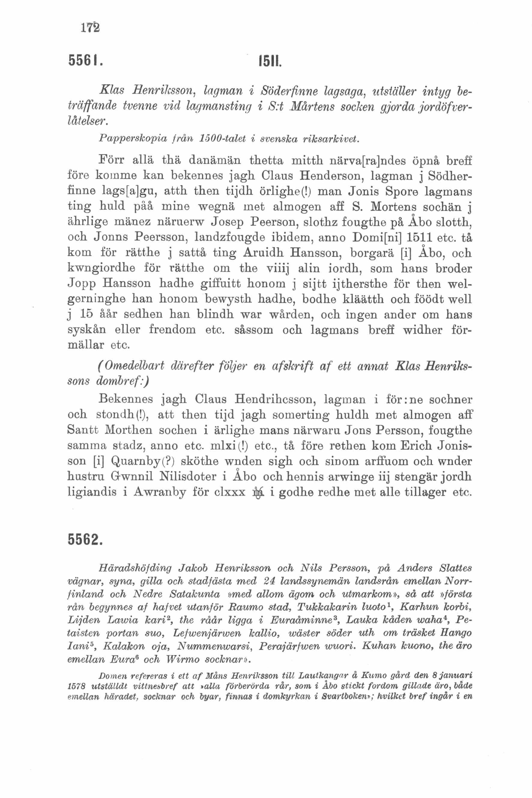 Klas Henriksson, lagman i Söderfinne lagsaga, utställer intyg beträffande två vid lagmansting i S:t Mårtens socken gjorda jordöverlåtelser.