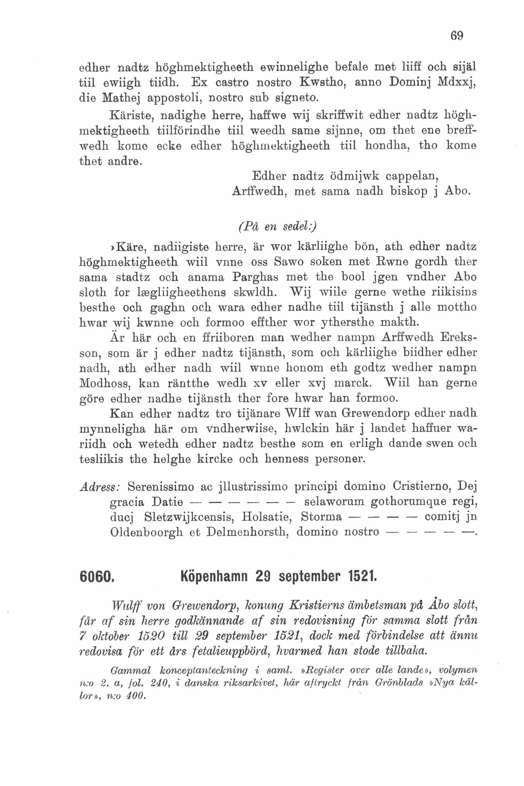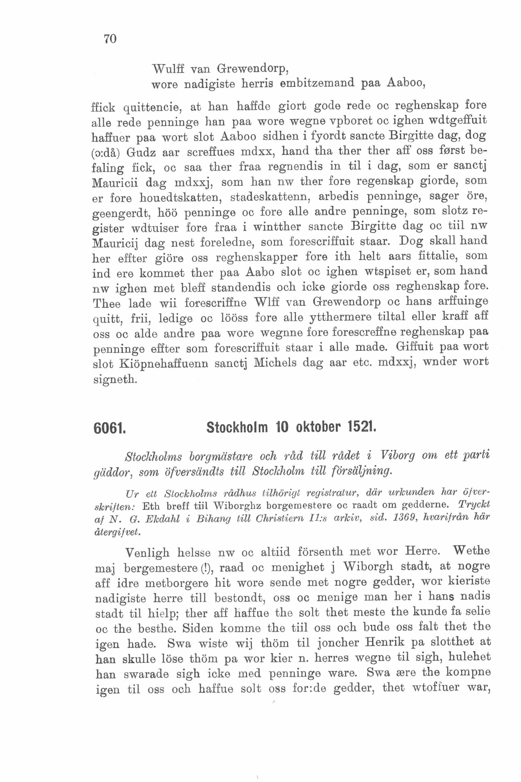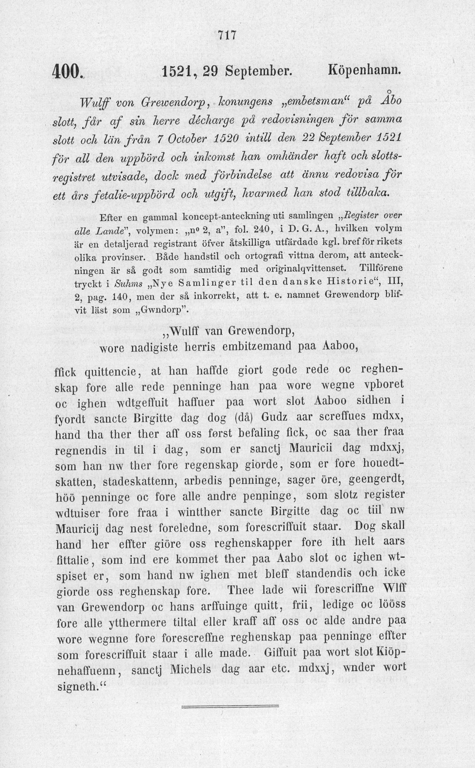 Wulff von Grewendorp, kung Kristians ämbetsman på Åbo slott, får av sin herre godkännande av sin redovisning för samma slott från 7 oktober 1520 till 29 september 1521, dock med förbindelse att ännu redovisa för ett års fetalieuppbörd, varmed han stod tillbaka.