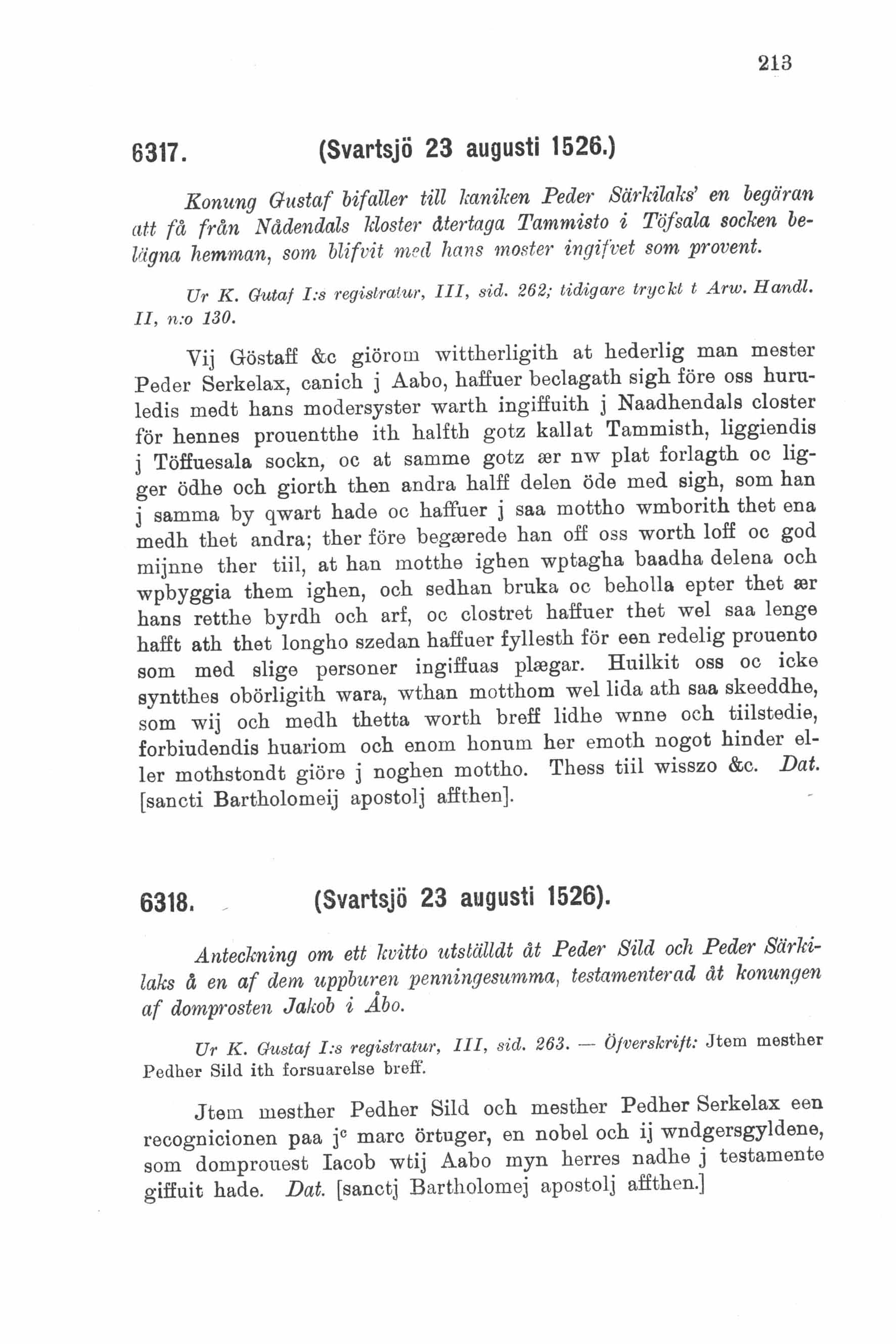 Anteckning om ett kvitto utställt åt Peder Sild och Peder Särkilax på en av dem uppburen penningsumma, testamenterad åt kungen av domprosten Jakob i Åbo.